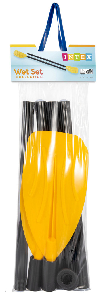 Plastová skládací vesla jsou pádla, určená k nafukovacím člunům, lehátkům a k dalším vodním plavidlům. Blíže se jedná o dvoudílné plastové násady s plastovým pádlem. Jednotlivé díly sady pádel INTEX se stabilně spojí sešroubováním. Díky pojistným kroužkům, které jsou součástí balení, mohou být pádla zafixována. Délka 122 cm. Vhodné od 18 let.