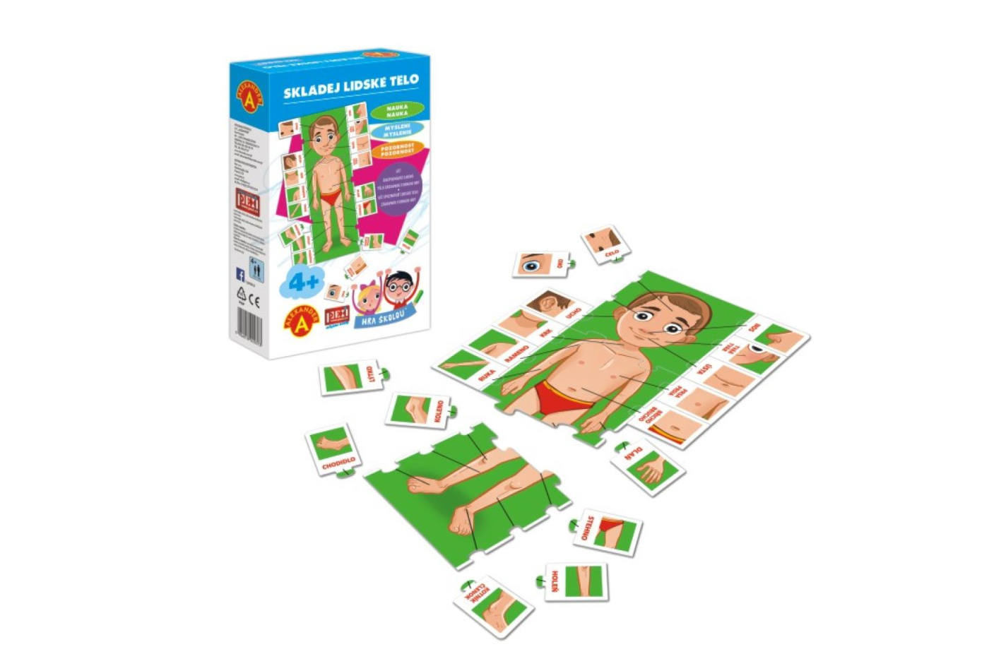 <p>Ocenění Hračka roku 2018-3.místo. HRA ŠKOLOU® - SKLÁDEJ LIDSKÉ TĚLO, je naučná hra pro děti od 4 let, pomocí níž se děti učí zábavnou formou rozvíjet slovní zásobu a paměť. Pomocí „puzzle“ kartiček se učí rozpoznávat, kde je na těle ruka, oko, prsty, nos…. a správně je pojmenovat. Každá kartička má jiný tvar, je jiná a tak zapadne pouze tam, kam patří. Naučná HRA ŠKOLOU® - SKLÁDEJ LIDSKÉ TĚLO je krabička, se kterou holčičky a kluci objevují lidské tělo. Víte kolik prstíků je na ruce, kolik máme nohou? Nebo kde je nos, pusinka, či ouško? To vše se děti teď hravě naučí. Celá postava člověka a její části je rozdělena na 3 větší destičky a 18 menších. Pevné destičky do sebe perfektně zapadnou a drží pohromadě jako dílky puzzle. Manipulace s kartičkami velice snadná. Zapojit do hry se může i více dětských hráčů, kteří mohou napovídat a pomáhat si a tak zjistit, jak může být lidské tělíčko zábavné. Hra obsahuje 3 velké destičky pomocí níž si složíte postavičku chlapečka. Váš nový "kamarád" má na sobě označené tenké linky, které pomáhají správně najít, kde má hlavičku, nohu, ruku, zápěstí, oko, nos či pusinku. Menší kartičky se přikládají podél tělíčka a vždy správně zapadnou do výřezu, pokud děti zvolí správné místo. Děti hra nejen zabaví, ale také přirozeně rozvíjí své logické uvažování, pozorovací a kombinační schopnosti. Tato hra je také vhodná i do školek a kolektivů, kde se děti mohou střídat v pokládání jednotlivých dílků a navzájem se povzbuzovat a opravovat. Pomáhá malým dětem, ve spolupráci s dopělým, poznávat a pojmenovat části svého těla. BENEFITY: - Děti poznají tělo od hlavy až k patě - Pomáhá zlepšovat motoriku a soustředění - Pomáhá s rozvojem vyjadřování - Rozvíjí slovní zásobu - Rozvíjí logické uvažování Hra je vhodná pro děti od 4 do 7 let . Obsah balení: 3 ks velkých destiček z pevného kartonu, 18 ks malých destiček s částmi těla, český a slovenský návod</p>