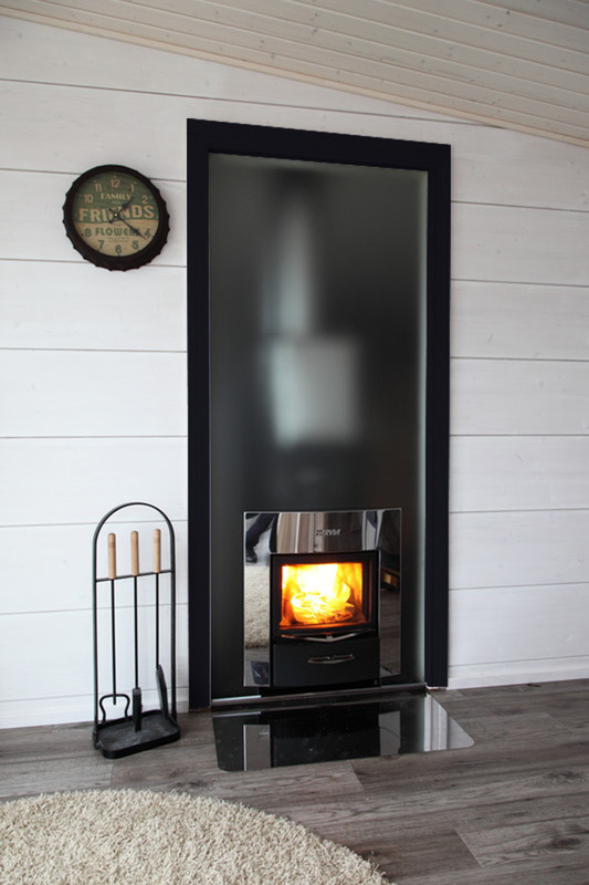 Skleněná stěna je výrazným interiérovým doplňkem umístěným za kamna. Skryje, ale zároveň zčásti přizná konstrukci kamen. Působí tak zvláštním technicky dekoračním dojmem.