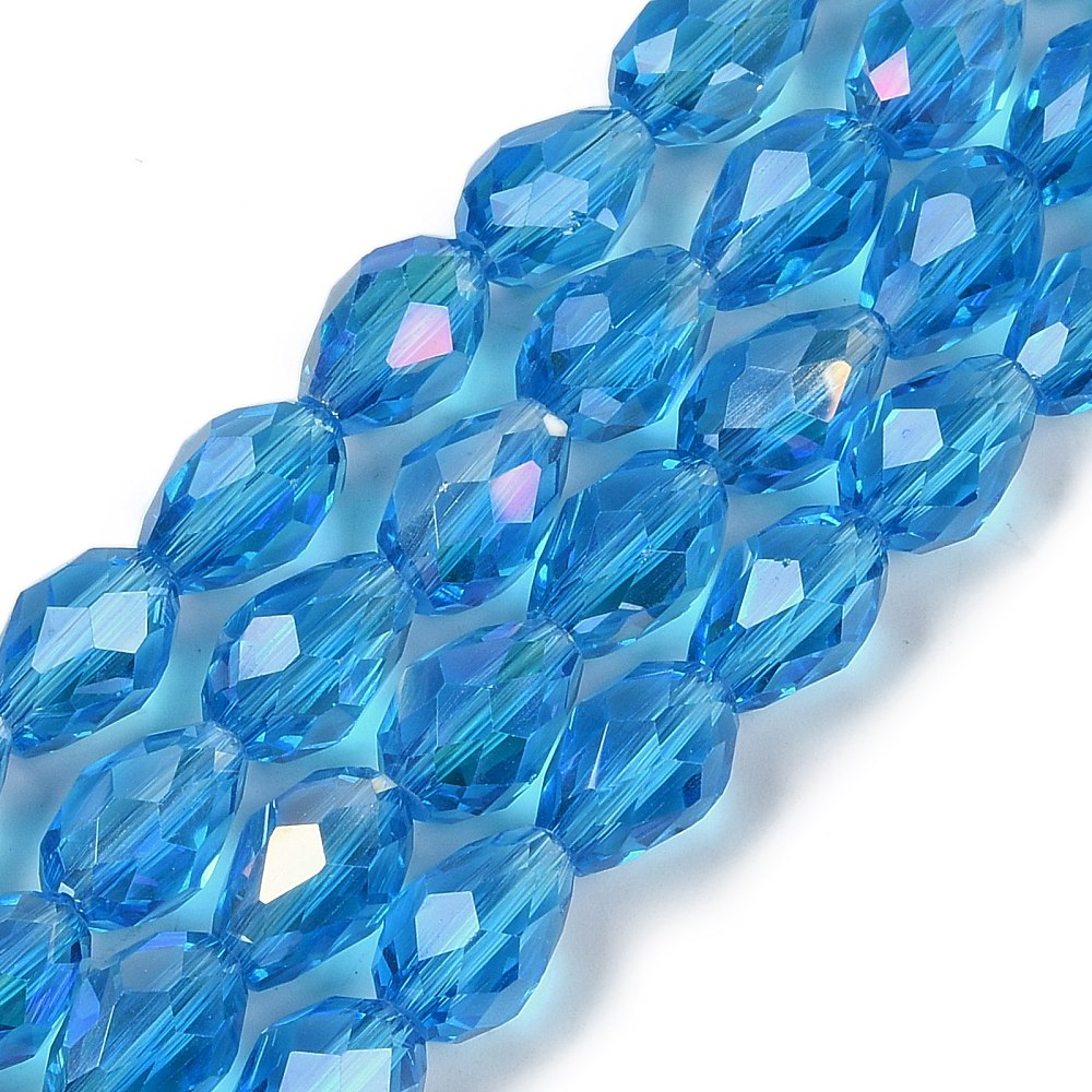 Tato broušená skleněná kapka o velikosti 15 × 10 mm zaujme na první pohled svou hloubkou barvy i třpytem. Transparentní tmavě modré (Dodger Blue) provedení je doplněno AB efektem (Aurore Boreale), který na povrchu vytváří jemnou duhovou vrstvu a při dopadu světla rozehrává nádherné barevné odlesky. Díky výrazným fasetám kapka krásně láme světlo a působí luxusně, téměř krystalickým dojmem. Je ideální jako dominantní prvek náhrdelníku, výrazných náušnic nebo slavnostního šperku, kde může skutečně vyniknout. Skvěle se kombinuje s kovovými komponenty i s jemnějšími broušenými korálky. Průvlek o velikosti cca 1,5 mm umožňuje pohodlné navlékání na ketlovací jehlu, nýty i pevnější návlekové materiály. Pokud hledáte kapku, která dodá šperku eleganci a hloubku, tato tmavě modrá varianta s AB efektem je krásnou volbou. Kapky prodáváme po jednom kusu.