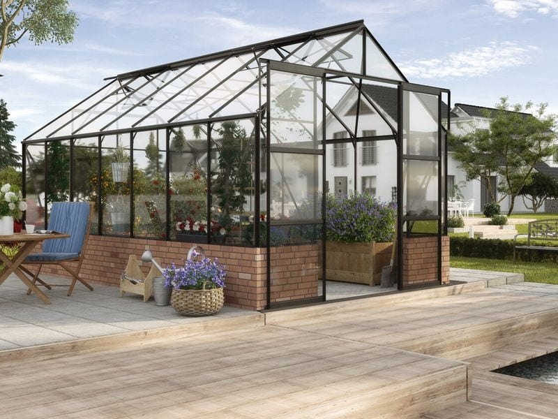 Hliníkový skleník, š 2,57 x d 3,85 m, černá barva, 4× stř. okno, kalené čiré sklo 3 mm, plocha 9,93 m2. Zakupte produkt Skleník ze skla Vitavia Cassandra 9900, tl. skla 3 mm (černý) z kategorie Heureka.cz | Dílna, stavba, zahrada | Zahrada | Péče o rostliny a pěstování rostlin | Zahradní skleníky za cenu 45990 Kč.