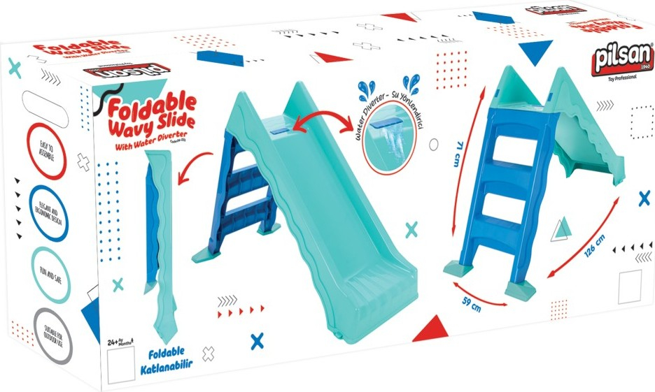 Dětská skluzavka Junior – délka skluzu 120 cm. Lze jednoduše složit pro snadnější uskladnění • Unikátní schůdky – vestavěná madla pro pohodlný a bezpečný výstup nahoru • Výborná stabilita díky široké základně • Ke skluzavce lze připojit hadici na vodu a tím kropit skluznou plochu.