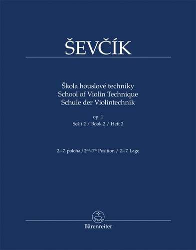 editor Jaroslav Foltýn- nové vydání stěžejního díla houslové pedagogiky- metodické komentáře editora ve třech jazycích (česky, anglicky, německy) ke každému sešitu- vybraná cvičení s alternativním prstokladem editora- nová obálka, moderní layout a tiskBärenreiter přichází s novým vydáním Školy houslové techniky legendárního českého pedagoga a houslisty Otakara Ševčíka (1852-1934). Jeho opus 1 je zcela výjimečný. Představuje první základní shrnutí zásad a poznatků vlastní metody, kterou Ševčík postavil proti tradičním výukovým systémům 19. století. Jeho metoda byla natolik průlomová, že se stala základem mnoha dalších houslových škol. Na opusu 1 vyrostly celé generace houslistů po celém světě a ani po více jak 130 letech od svého vzniku Ševčíkova houslová škola nezastarala.Nové vydání čtyř sešitů Školy houslové techniky op. 1 vychází v zásadě z prvního tištěného vydání z počátku 20. století, ale pracuje i s dalšími prameny ze Ševčíkovy pozůstalosti. Edici připravil profesor Pražské konzervatoře Jaroslav Foltýn, přímý žák Ševčíkova asistenta Viktora Noppa a pokračovatel jeho pedagogického odkazu na téže škole.Opusem 1 zahajuje Bärenreiter sérii nových vydání nejvýznamnějších Ševčíkových děl.Obsah: autor hudby / textu / skladbaŠevčík Otakar: Cvičení ve 2. polozeŠevčík Otakar: Cvičení ve 3. polozeŠevčík Otakar: Cvičení ve 4. polozeŠevčík Otakar: Cvičení ve 5. polozeŠevčík Otakar: Cvičení ve 6. polozeŠevčík Otakar: Cvičení ve 7. poloze
