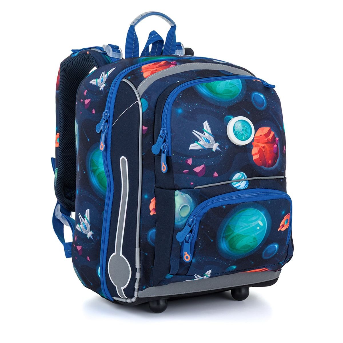 Model BEBE je kompromis mezi aktovkou a školním batohem, který je vhodný pro malé kluky s výškou od 110 cm. Inspirací pro motiv nám byly počítačové herní konzole. Školní aktovka je navržená s ohledem na potřeby malých školáků – je lehká, přehledná a skvěle sedí na zádech. Hravý vesmírný motiv plný planet, raket a galaxií nadchne všechny malé objevitele, kteří se chtějí vydat na svou první školní misi. Aktovka má pevná, tvarovaná záda, která podporují správné držení těla, a pohodlné, měkce polstrované ramenní popruhy, jež se snadno přizpůsobí postavě dítěte. Díky stabilní konstrukci aktovka dobře drží tvar a samostatně stojí. Vnitřní prostor je prakticky rozdělený, aby se školní pomůcky snadno organizovaly. Samozřejmostí jsou reflexní prvky, které zvyšují bezpečnost dítěte na cestě do školy i ze školy. Design aktovky lze navíc sladit s dalšími doplňky – ke stejnému motivu je dostupný také školní penál PENN 26013, se kterým vznikne dokonale sladěný školní set. BEBE 26013 je ideální školní aktovka pro první školní roky – spojuje funkčnost, pohodlí a hravý design inspirovaný vesmírem. Hlavní charakteristika: váží 1 080 gramů pevná lisovaná záda s hliníkovou výztuhou jedna komora s nepropustným organizérem a dvě malé kapsy reflexní prvky: na čele a bocích batohu, na ramenních popruzích magnetky na koncích ramenních popruhů (pro snazší uchycení vlajících konců) pevné, nepropustné dno z materiálu TOPDURA s nožičkami poutka pro bederní pás TOP 24021 a TOP 24022 poutko na zavěšení batohu na lavici výškově nastavitelná hrudní přezka odnímatelná karabina na klíče nastavitelné ramenní popruhy batoh byl testován v ITC Zlín PU zátěr proti dešti Aktovka se vejde pouze do dárkové krabice GIFT BOX CARTOON MAXI! Upozornění: K tomuto střihu aktovky BEBE nedoporučujeme používat desky na sešity FOLDER. Vhodné jsou pouze desky ve velikosti A4.