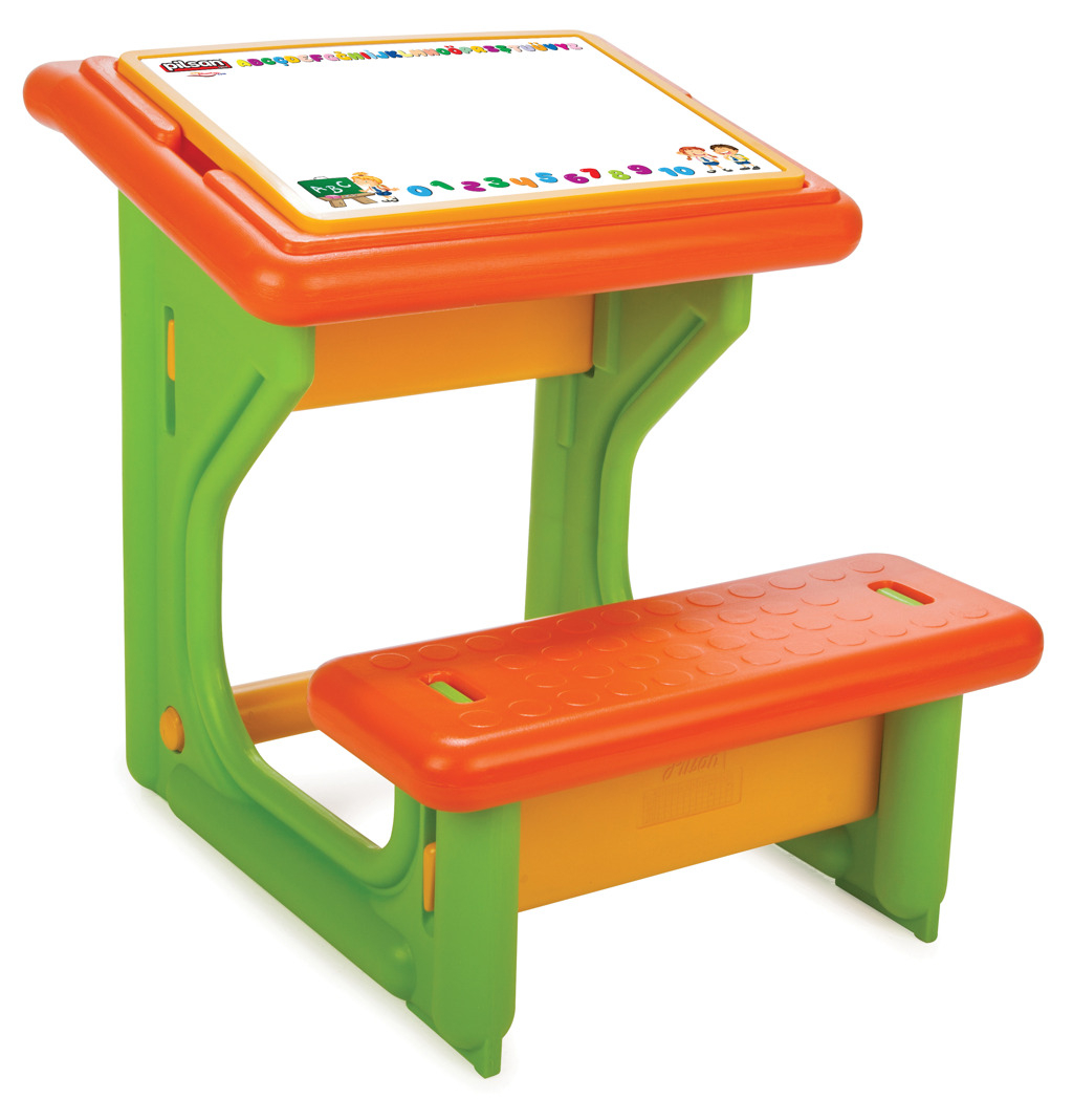 Dětská lavice pro malého študáka. Pracovní deska se sedátkem o rozměrech 66×54 cm a výšce 62 cm.