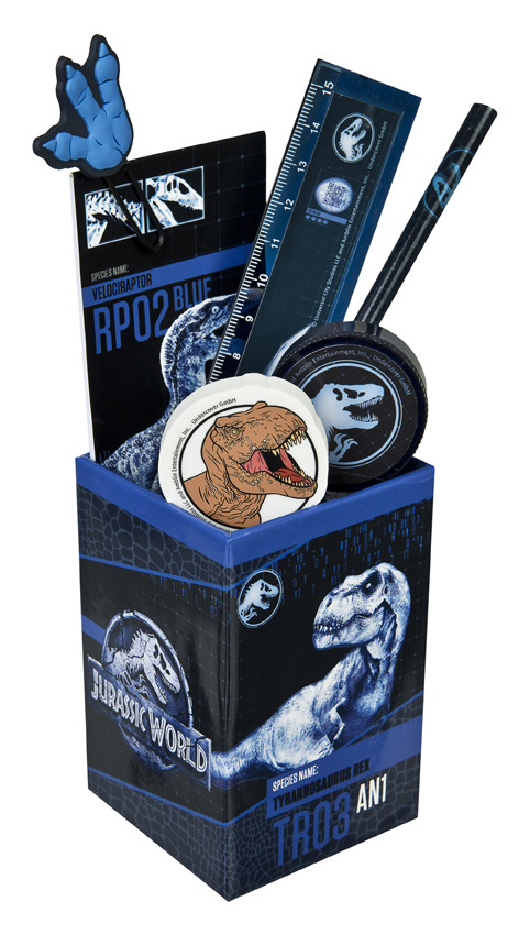 Kelímek se školními potřebami – obsahuje tužku, gumu, ořezávátko, pravítko, mini notýsek, velký papírový, tvarovaný klip.