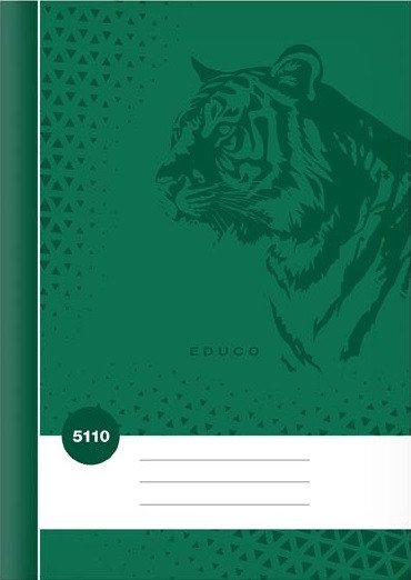 Školní sešit ve formátu A5, čtverečkovaný, v tmavě zelené barvě, s motivem tygra, v deskách z křídového papíru. Oproti běžným čtverečkovaným sešitům je rozměr čtverečků dvakrát větší. Typ: 5110 Motiv: tygr Formát: A5 Barva: zelená Gramáž listů papíru: 60 g Počet listů: 10, čtverečkované Rozměr čtverečku: 10 x 10 mm Desky: matný křídový papír 200 g