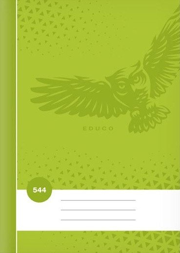 Školní linkovaný sešit ve formátu A5, v zelené barvě, s motivem sovy, v deskách z křídového papíru. Stránky jsou opatřeny okraji o šířce 1,5 cm. Typ: 544 Formát: A5 Motiv: sova Barva: zelená Šířka řádku: 8 mm Počet listů: 40, linkované Gramáž listů papíru: 60 g Desky: matný křídový papír 200 g