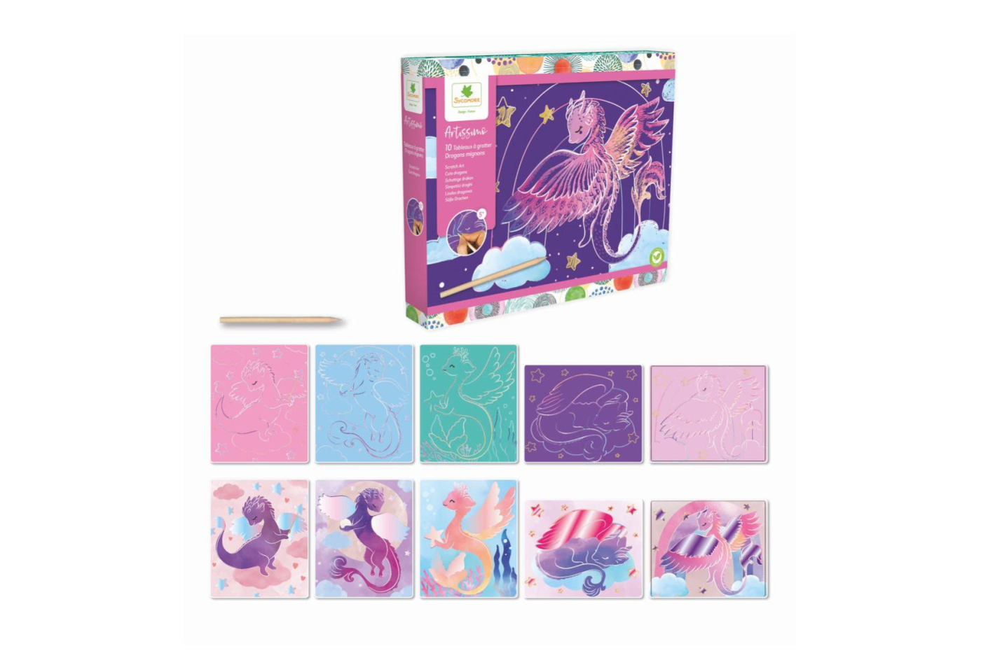 Škrabací obrázky s motivy dráčků v krásném barevném provedení, zavedou děti do pohádkového světa fantazie. Balení obsahuje: 10 kusů škrabacích obrázků, dřevěné škrabátko ve tvaru tužky s hrotem a barevný návod. Baleno v luxusní pevné krabičce se zavíráním na magnet, která poslouží jako skvělý úložný box. Doporučeno pro děti od 5 let. Velikost balení: 26 x 22 x 4 cm.