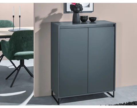 Skříňka 2-dveřová z řady Cologne má šířku 80 cm a je vyrobena v antracitově šedém provedení. Moderní minimalistický styl dotváří černá kovová podnož.