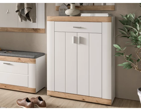 Skříňka s policemi/botník z kolekce Laredo - elegantní bílý nábytek s dubovým dřevodekorem má okrasně rylované linie a široké přední rámy se zaoblením.