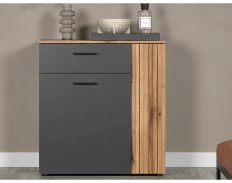 Skříňka se zásuvkou z programu Esteban - nábytek v kombinaci antracitově šedá/dub je moderní a zároveň útulný. Rylovaná optika vytváří zajímavý lamelový efekt.