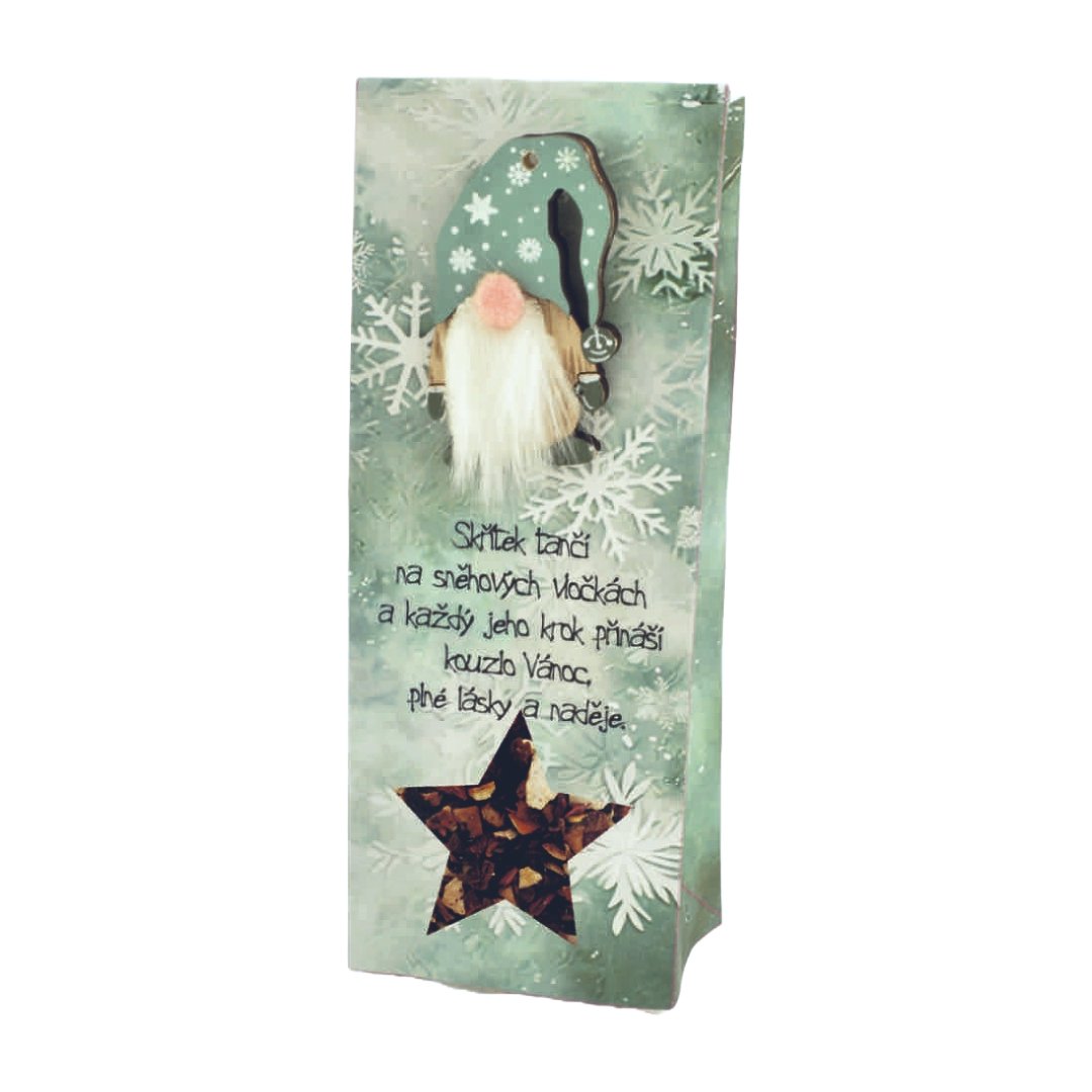 Mandle v mléčné čokoládě se skořicí v dárkové krabičce s motivem sněhových vloček a dřevěnou figurkou skřítka.Motiv figurky se může lehce lišit od fotografie podle aktuálních zásob. Text: Skřítek tančí na sněhových vločkách a každý jeho krok přináší kouzlo Vánoc, plné lásky a naděje. Složení:jádra mandlí pražené 29%, mléčná čokoláda 70% (cukr, kakaové máslo, kakaová hmota, sušené mléko, sušená syrovátka, mléčný tuk, emulgátory: sojový lecitin a E476, aroma vanilin), mletá skořice 1%Může obsahovat stopy jiných skořápkových plodů. Alergeny:mandle, sójový lecitin, sušené mléko, sušená syrovátka, mléčný tukObsah kakaové sušiny v čokoládě nejméně 32,1%. Průměrná výživová hodnota na 100g výrobku:Energetická hodnota 2 367kJ / 565kcal.Tuky 37g, z toho nasycené mastné kyseliny 15g, Sacharidy 47g, z toho cukry 41g, Vláknina 5,5g, Bílkoviny 9,8g, Sůl 0,19g. Země původu: Česká republika 80g