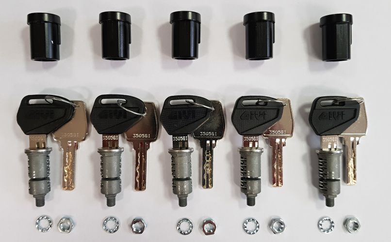 5 zámky, každý se 2 klíči pro motocyklové kufry GIVI - obsahuje 5 zámky, 10 klíčů, 5 pouzder zámku a 5 bezpečnostních zápatek. Pro kufry MONOKEY TRK 52 - TRK 33 - TRK 46 - E 55 - E 55NT - V 35 - V 35NT - V 47 - V 47NT - V 46 - V 46NT, B 33NMK dále pro kufry MONOLOCK E 470 - E 450 - E 370 - E 370NT - E 340 - E 260 - E 230 - EK 26 - B 36N - B 47 - B 47NT - B 37 - B 37NT - B 33NML. Nelze použít pro E 52 - E 41 - E 360 - E 460 - E 21 - E 36 - E 45 - E 300 - E 300B - E 30. Lze použít také pro schránku na nářadí S 250 Toolbox.