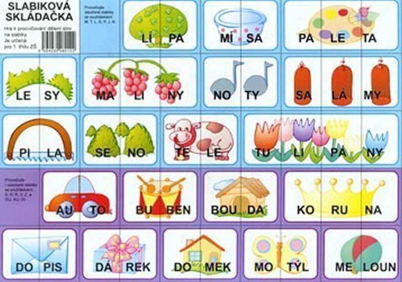 Hra je určena dětem v první třídě ZŠ a pomáhá při výuce slabikování. Po rozstříhání obrázků děti hledají správné části obrázku a přitom si zafixují slabiku na části obrázku. Obtížnost slov vzrůstá od modrého pozádí, přez fialové, růžové, žluté, až k zelenému. Lze proto zpočátku pracovat jen s první (druhou...) částí hry. Postup obtížnosti (včetně barev pozadí) koresponduje nejlépe s postupem výuky ve slabikáři od našeho vydavatelství.