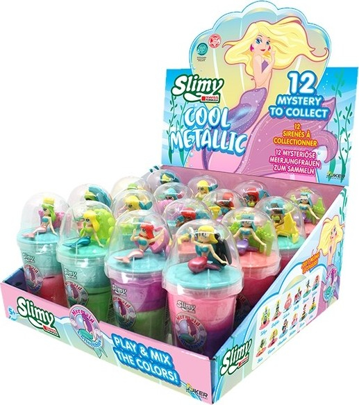 Slimy s mořskou pannou představuje zábavnou a kreativní hračku, která kombinuje populární sliz (slime) s motivem mořských panen. Každý produkt je balen v průhledném plastovém kelímku, kde barevný sliz tvoří spodní část. Na víčku je umístěna malá figurka mořské panny v různých barevných provedeních a s různými doplňky, jako jsou koruny, mušle nebo trůny. Přiložená figurka je chráněna průhledným krytem, který zároveň slouží k bezpečnému skladování a prezentaci hračky. Kelímky mají různé kombinace barev slizu, například růžovou, fialovou, zelenou a modrou, což zvyšuje atraktivitu produktu a možnost sběratelství. Hračka je určena pro děti od 3 let a nabízí možnost nejen hrát si se slizem, který má příjemnou gelovou konzistenci a je dermatologicky testovaný pro citlivou pokožku, ale také sbírat všechny dostupné varianty figurek mořských panen. Výrobek obsahuje 12 různých variant, které děti mohou objevovat a doplňovat svou sbírku. Všechny složky slizu jsou přírodní a bezpečné, bez obsahu parabenů, což zajišťuje zdravotní nezávadnost a splnění mezinárodních bezpečnostních norem. Produkt je ideální volbou pro děti, které rády tvoří a hrají si s texturami, zároveň si užijí pohádkovou tematiku mořských panen. Balení i samotný design hračky jsou přizpůsobeny tak, aby upoutaly pozornost a zároveň zajistily snadné a bezpečné používání. Díky kombinaci barevného slizu a detailních figurek mořských panen je Slimy s mořskou pannou jak zábavnou hračkou, tak sběratelským předmětem vhodným pro mladší děti.
