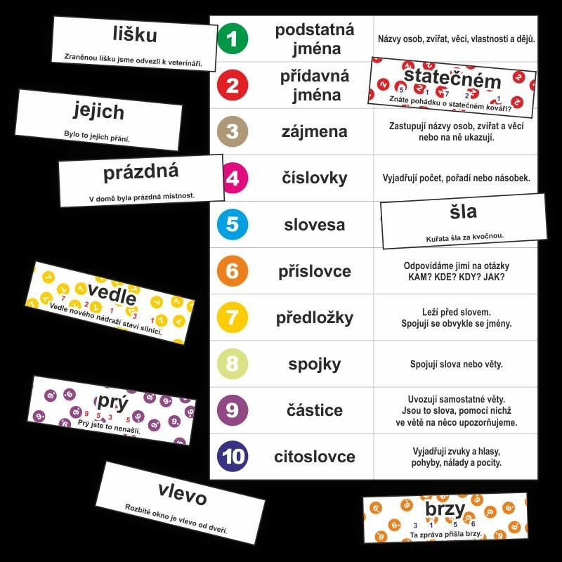 580 kartiček k procvičování slovních druhů. Na kontrolní straně je určen slovní druh všech slov ve větě. Součástí je i podložka (1 kus) - Slovní druhy - podložka.