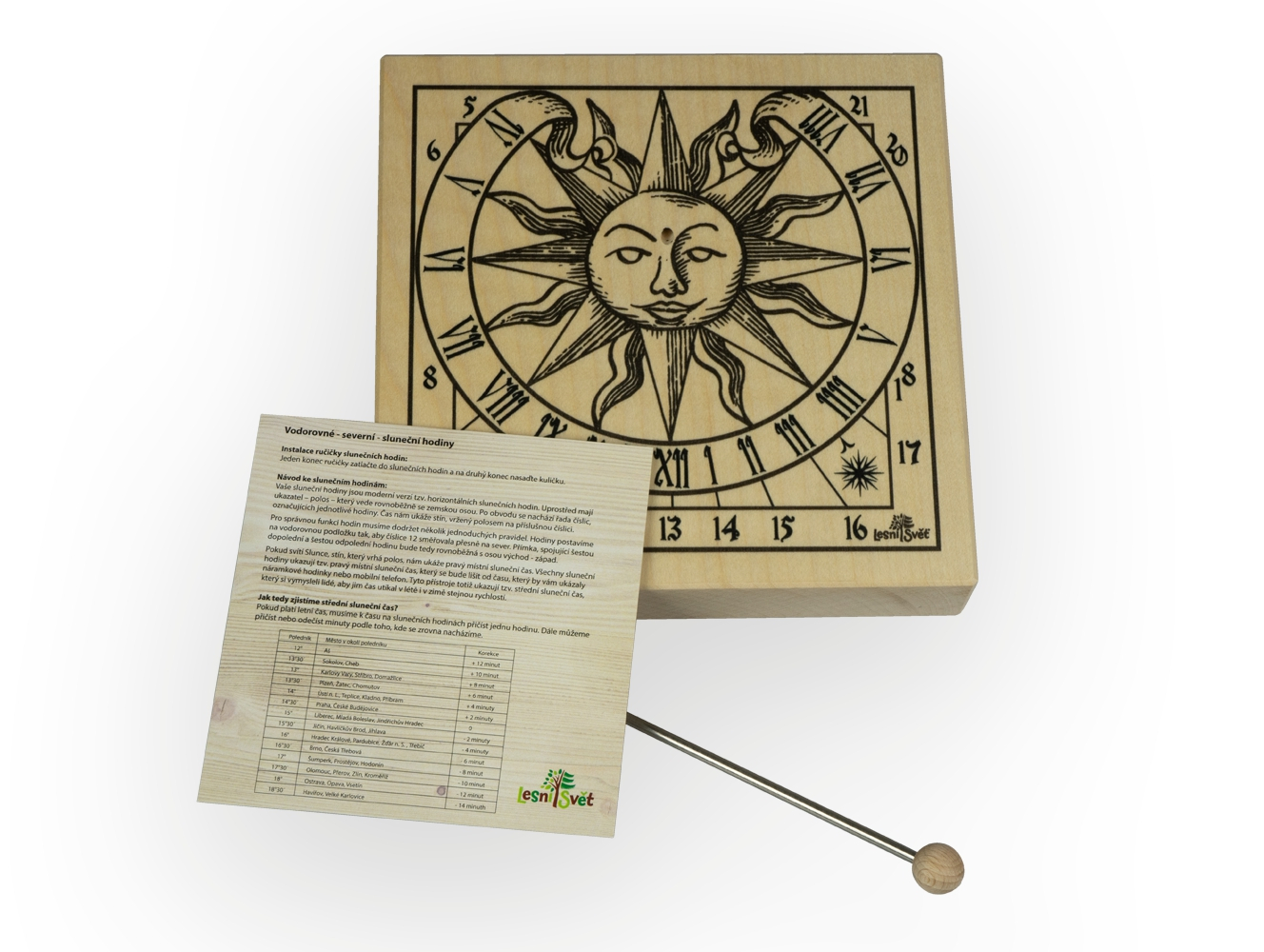 Sluneční hodiny vyrábí u nás v dílně české ruce z kvalitního certifikovaného dřeva Balení obsahuje 1x sluneční hodiny z bukového masivu, 1x tyčku a dřevěný korálek k hodinám, 1x návod na používání hodin. Hodiny ukazují orientační čas. Hodiny jsou natištěné. Baleno v sáčku. Autorem kreseb jsou čeští ilustrátoři, obrázky jsou chráněny autorskými právy. Sluneční hodiny zábavnou formou seznamuje děti i dospělé s přírodou. Hodiny mají rozměr 15 x 15 x 2,5 cm. Lesní svět = značka s ekologickým certifikátem udržitelného hospodářství PEFC. Všechny výrobky jsou vyrobeny s ohledem na životní prostředí.
