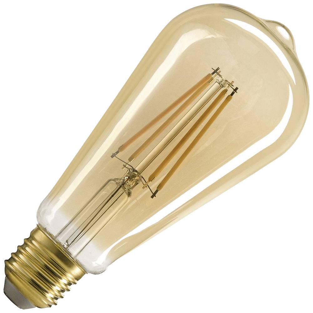 Zlatý 7,5W SLV LED světelný zdroj s paticí E27 a ST64 tvar je stmívatelná, má hodnotu CRI 90, 700 lumenů a životnost 15.000 hodin. Tato verze má vyzařovací úhel 320° a je teplá bílá s 2.500 k.