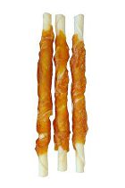 Doplňkové krmivo pro psy - pamlsek lisovaný z kůže, obalený sušeným kuřecím masem