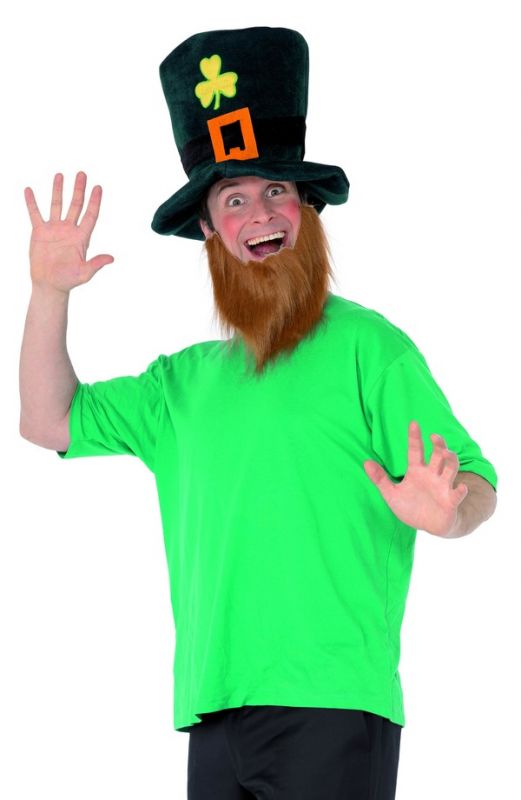 Klobouček Irského skřítka, zelený, jetel pro štěstí, spona a zrzavé vousy