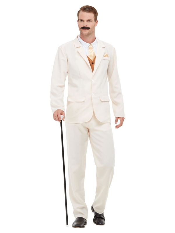 Kostým zahrnuje stylové sako, kalhoty a falešnou košili, která dodává autentický vzhled bez nutnosti vrstvení. Ideální pro tematické večírky, Gatsby party, divadelní představení nebo karnevaly.