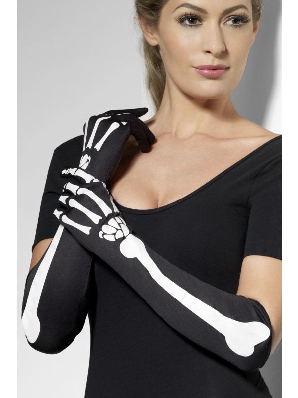 Halloweenské dlouhé rukavice s kostmi skvěle doplní Váš halloweenský kostým nebo kostým kostlivky či kostlivce.