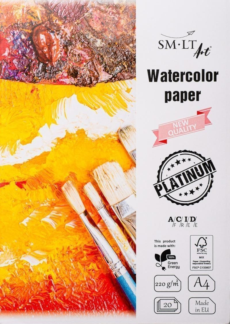 Akvarelový papír „Platinum“ „SMLT ART“ na bázi za studena lisované celulózy se střední zrnitostí pro akvarelové a kombinované práce, 220g/m2. Neobsahuje kyseliny, má dlouhou životnost a neutrální pH. S tvrdým hřbetem a certifikátem FSC.