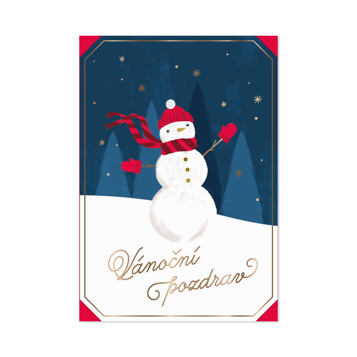 Vánoční přání s malovaným sněhulákem. Uvnitř přání najdete krátkou báseň a místo pro vlastní věnování. Text uvnitř přání: Krásné vánoční svátky, od Ježíška hezké dárky, kupu štěstí, radosti, pohody, a v novém roce bez nehody. Součástí balení je i bílá obálka. Rozměry: 13,5 × 19,5 cm