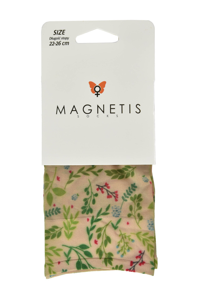 Wprowadź do swojej stylizacji nutę świeżości i natury dzięki skarpetkom Magnetis 15 DEN. Beżowa baza ozdobiona kolorowym, roślinnym motywem w zieleni, błękicie i czerwieni sprawia, że stają się one wyjątkowym dodatkiem – subtelnym, a zarazem pełnym życia. To idealny wybór dla kobiet ceniących detale, które dodają stylizacjom lekkości i oryginalności.Delikatna tkanina o grubości 15 DEN sprawia, że skarpetki są lekkie i przewiewne. Wykonane z wysokiej jakości poliamidu z dodatkiem elastanu, zapewniają doskonałe dopasowanie i komfort noszenia przez cały dzień.