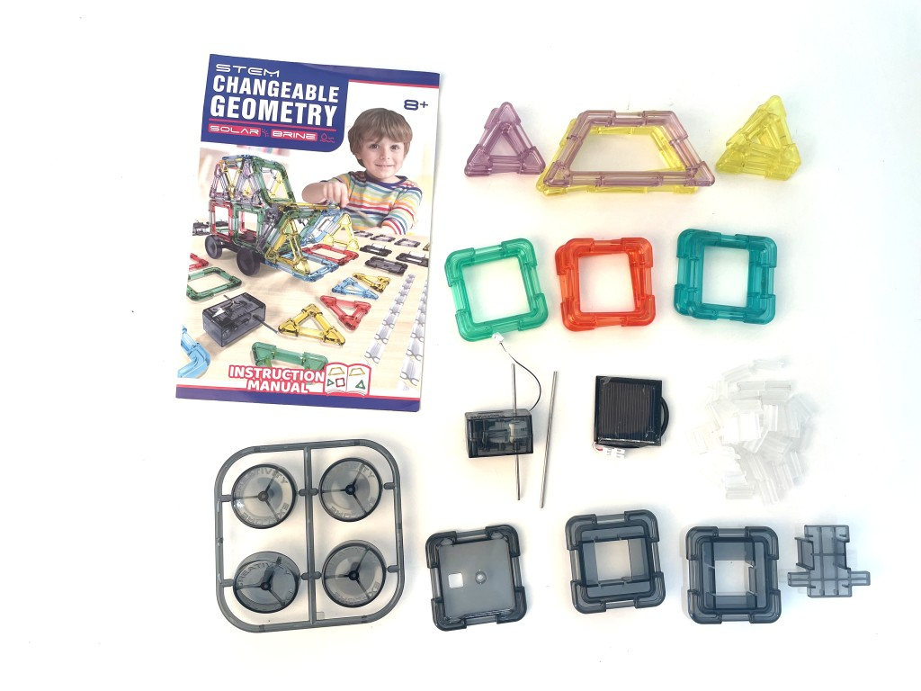Solární geometrická stavebnice. Sada obsahuje 62 dílků včetně solárních panelů a motorového panelu. Doporučený věk od 8 let. Baterie nejsou součástí balení.