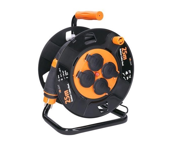 25m gumový kabel na bubnu z odolného plastu a čtyřmi zásuvkami je ideální pro použití venku, na zahradách, stavbách nebo v dílnách. Bytelná konstrukce s krytými zásuvkami i kabel samotný jsou odolné proti povětrnostním podmínkám a mechanickému namáhání.