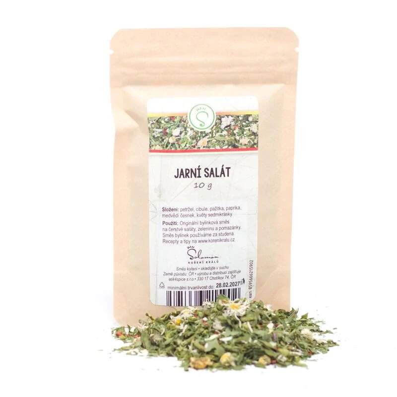 Jedinečná směs bylinek na salát kombinující aromatické bylinky jako je medvědí česnek nebo pažitka s něžnými květy sedmikrásek. Co může být lepší symbol jara než zelené bylinky a bílo žluté květy sedmikrásek? Složení: petržel, cibule, pažitka, paprika, medvědí česnek, květy sedmikrásky. Proč právě směs bylinek a sedmikrásek? Chuť: Petržel, medvědí česnek a pažitka dodají pokrmům svěží, mírně pikantní chuť, zatímco květy sedmikrásky přinesou jemnou sladkost. Estetika: Květy sedmikrásek dodají vašim pokrmům krásný vzhled a jarní atmosféru. Zdraví: Bylinky a květy sedmikrásky jsou bohaté na vitamíny a minerály. Medvědí česnek podporuje imunitní systém, petržel zlepšuje trávení a květy sedmikrásky mají protizánětlivé účinky. Nápadité využití směsi bylinek a sedmikrásek Saláty: Směs bylinek a květů sedmikrásek je ideální pro dochucení různých druhů salátů. Vyzkoušejte například salát s kozím sýrem, ořechy a medem. Pomazánky: Přidejte směs bylinek do sýrových nebo luštěninových pomazánek. Bylinkové máslo: Přidejte bylinky do změklého másla a nechte opět ztuhnout. Barevná a chuťová kombinace je úžasná. Dresinky: Vytvořte si vlastní domácí dresink na bázi olivového oleje, citronové šťávy a směsi bylinek. Omáčky: Ochutnejte sýrové omáčky s bylinami k těstovinám nebo masu. Vařená vejce: Posypte bylinkami natvrdo vařená vejce.