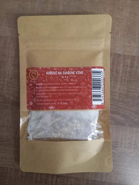 Porcované koření na svařené víno v kvalitě sypaného Aromatická nahrubo drcená směs do svařeného vína nebo punče. Na 0,25 l vína přidáme 1 sáček směsi. Do svařeného vína můžeme přidat i ovocný džus (pomerančový, jablečný, višňový) nebo rum či griotku. 5 x 4g Složení: pomerančová kůra, skořice, hřebíček 20g