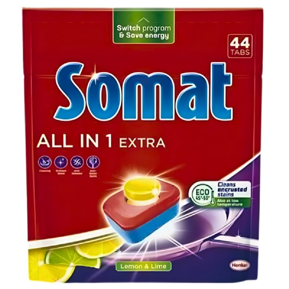 Somat tablety do myčky All in 1 Extra Lemon & Lime, 44 ks Somat All-in-1 Extra Lemon & Lime tablety do myčky s vůní citronu a limetky neutralizující zápach pro zářivě čisté nádobí i na krátké a eco programy s nízkou teplotou! Vyzkoušejte účinnou mycí sílu s tabletami do myčky Somat All-in-1 Extra. Jejich silné a rychle působící složení se vypořádá se zaschlými zbytky jídla a rozpustí skvrny od čaje a kávy, a to i na krátké programy s nízkou teplotou. Tablety do myčky Somat All-in-1 Extra jsou určeny k použití na všechny talíře, sklenice, hrnky, láhve, stříbrné nádobí, příbory, hrnce a pánve vhodné do myčky. S tabletami do myčky Somat jsou nádobí a sklenice po každém mytí dokonale čisté, a to i při použití ekologického programu s nízkou teplotou. Značka Somat se rovněž zasazuje o čistší svět: náš závod pracuje se 100% obnovitelnou elektřinou a z naší výroby se nevyváží žádný odpad na skládky. Tablety do myčky Somat All-in-1 Extra jsou speciálně vyvinuty pro krátké a eco programy s nízkou teplotou.