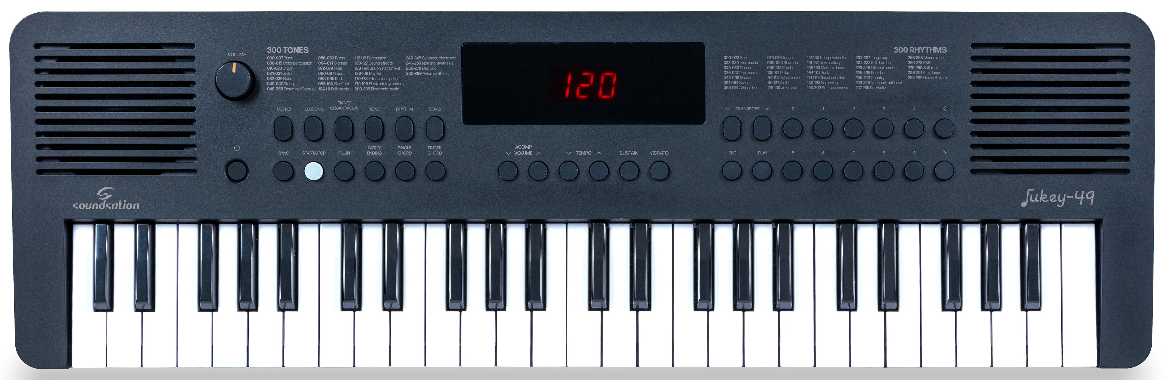 Klávesy bez dynamiky Kompaktní keyboard Soundsation JUKEY-49 je ideální volbou zejména pro děti a mladé hudebníky, kteří s hrou na klávesové nástroje teprve začínají. Je vybaven 49 klávesami mini velikosti a díky jeho kompaktním rozměrům (642 x 200 x 68 mm, 1,8 kg) jej ocení také muzikanti, kteří hledají nástroj na cesty. Keyboard lze navíc napájet pomocí přiložené power banky s kapacitou 5000 mAh, takže je na cestování jako dělaný. Pro vaše hudební objevování je připraveno 300 různých zvuk