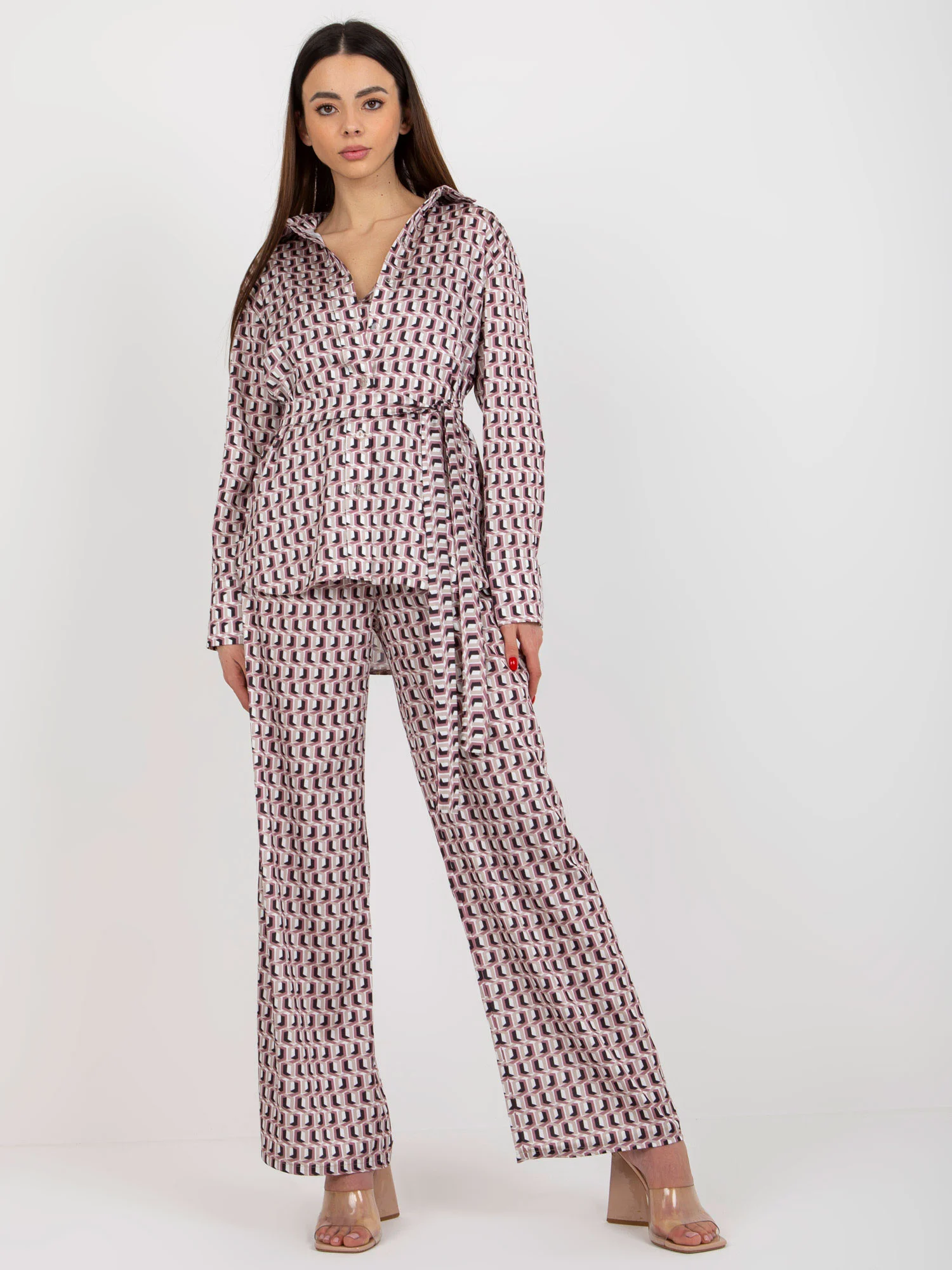 Béžovo-růžová elegantní třídílná souprava s horním dílem. Kód produktu: LK-KMPL-509001.42P dominantní design: tisk styl: ležérní příležitost: neformální, do města, na procházku, na rande Modelka má na sobě velikost S/M. Rozměry modelky: výška 175 cm, poprsí 84 cm, pas 62 cm, boky 91 cm. Rozměry soupravy ve velikosti S/M měřené na plocho: šířka košile v podpaží - 55 cm, délka rukávů - 58 cm, délka košile (vpředu) - 67 cm, délka košile (vzadu) - 75 cm šířka topu v podpaží - 46 cm, délka topu - 62 cm šířka kalhot v pase - 32 cm, výška topu - 31 cm, délka kalhot - 108 cm.Velikost Alt.VýškaObvod hrudníku hrudníkExterní. délka. rukávVnitřní. délka rukávůS/M36/38160-17282-8659-6149-51L/XL40/42164-17891-9663-6553-55