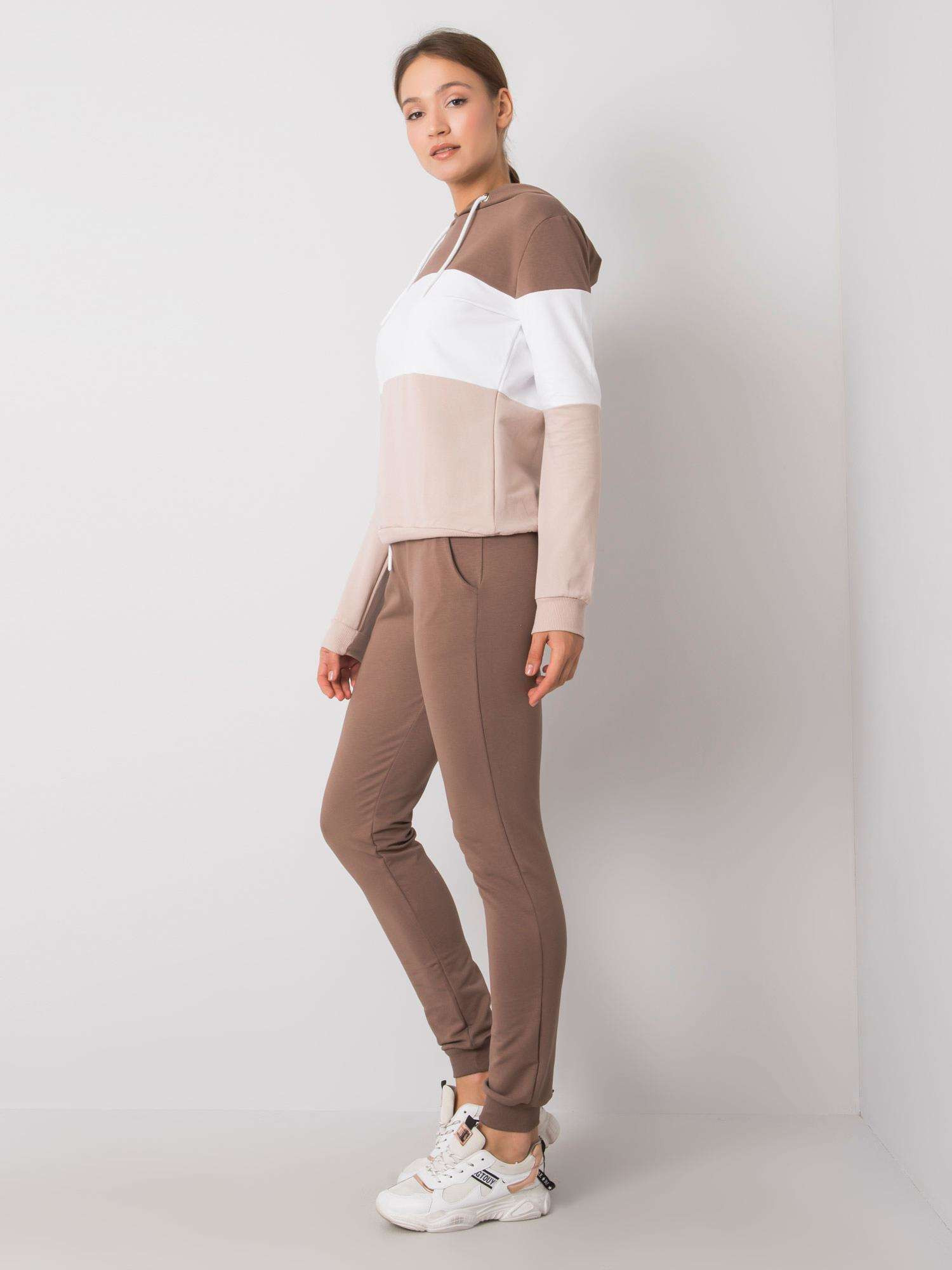 Hnědo-béžová tepláková souprava. sada obsahuje: mikinu, kalhoty složení materiálu: 90 % bavlna, 10 % elastan způsob praní: praní v pračce na 30 °C Modelka má na sobě velikost S/M. Rozměry modelky: výška 180 cm, prsa 89 cm, pas 63 cm, boky 93 cm. Rozměry soupravy ve velikosti S/M měřené na plocho: šířka v podpaží - 49 cm, délka halenky - 60 cm, délka rukávu - 61 cm, šířka v pase - 35 cm, délka kalhot - 95 cm Velikost Alt. Výška Obvod hrudníku hrudník Externí. délka. rukáv Vnitřní. délka rukávů S/M 36/38 160-172 82-86 59-61 49-51 L/XL 40/42 164-178 91-96 63-65 53-55