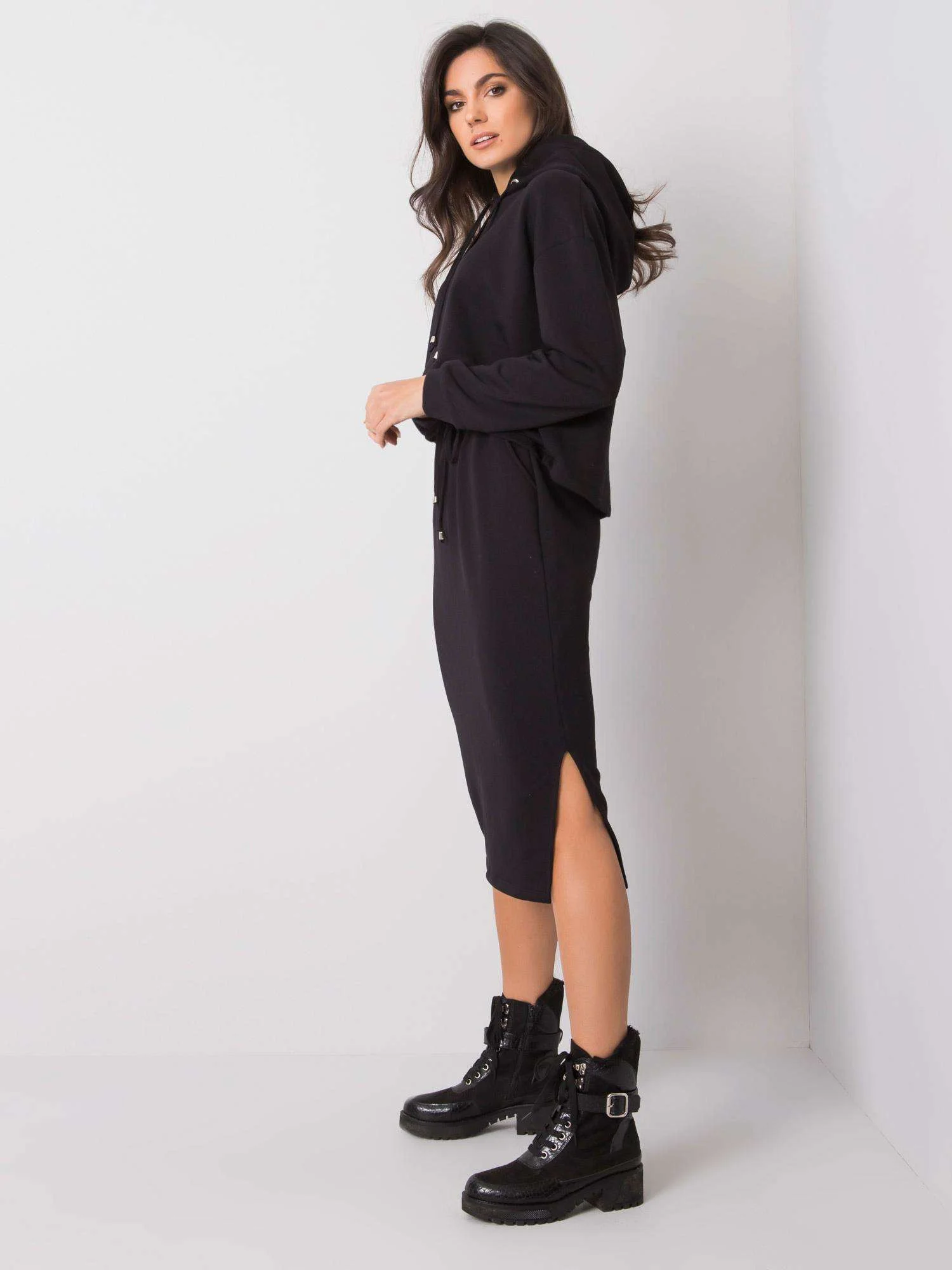 RUE PARIS Černá bavlněná souprava. Souprava obsahuje: mikinu, sukni. složení látky: 90 % bavlna, 10 % elastan způsob praní: praní v pračce na 30 °C Modelka má na sobě velikost S. Rozměry modelky: výška 175 cm, prsa 85 cm, pas 65 cm, boky 89 cm. Rozměry soupravy ve velikosti S měřené na plocho: šířka v podpaží - 61 cm, délka halenky - 49 cm, délka rukávů - 60 cm, šířka v pase - 37 cm, délka sukně - 73 cmVelikost Alt.VýškaObvod hrudníku hrudníkExterní. délka. rukávVnitřní. délka rukávůS36160-164825949M38162-172866151L40164-174916353