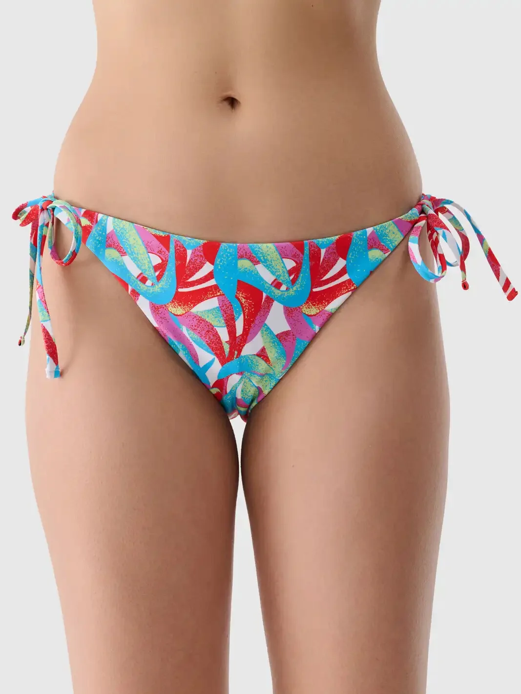 Spodní díl plavek zaujme svým originálním vzorem. Střih je klasický a lichotivý, s mírným vykrojením, které podtrhuje postavu. Na bocích jsou nastavitelné šňůrky, které umožňují individuální přizpůsobení a dodávají plavkám hravý prvek. Ideální volbou pro milovnice stylových plavek.