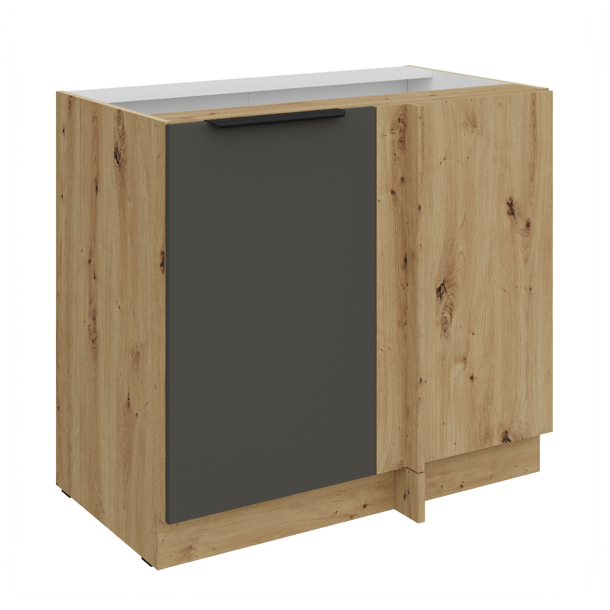 Spodní rohová skříňka Aria 105 ND 1F BB Vlastnosti: Materiál Laminovaná dřevotřísková deska o síle 16 mm Zakončené hrany ABS hrana o síle 1 mm Anti Finger Print Jedná se o speciální povrchovou úpravu, kdy na povrchu dvířek / čel zásuvek nezůstávají otisky prstů. Úchyt Matný kovový černý úchyt Sokl Součástí balení Vnitřní barva Vnitřek skříně je bílý Vnitřní uspořádání Jedna police Panty / Pojezdy Panty s tlumeným zavíráním Strana otevření Dvířka lze umístit vpravo nebo vlevo - volba při montáži Nutné odsazení Prostor na zdi, který je třeba ponechat pro skříňku s pracovní deskou, je 105 cm • Barevné kombinace K dispozici je celkem 15 barevný kombinací - 3 barevné varianty korpusu a 5 barevných variant dvířek. Dub artisan korpus Bílá matná korpus Černá matná korpus BL - Black AFM dvířka / čela zásuvek SA - Aquamarine AFM dvířka / čela zásuvek TA - Sandgrau AFM dvířka / čela zásuvek GR - Graphite AFM dvířka / čela zásuvek WH - Crystal white AFM dvířka / čela zásuvek • Rozměry:Šířka s pracovní deskou:90 cmŠířka bez pracovní desky:105 cmVýška bez pracovní desky:82 cmHloubka bez pracovní desky:52 cmPočet balení:2 krabice • Odkazy na příslušenství ke kuchyňským linkámKompletní nabídka skříněk ke kuchyňské lince AriaPracovní deskyPříslušenství ke kuchyním •