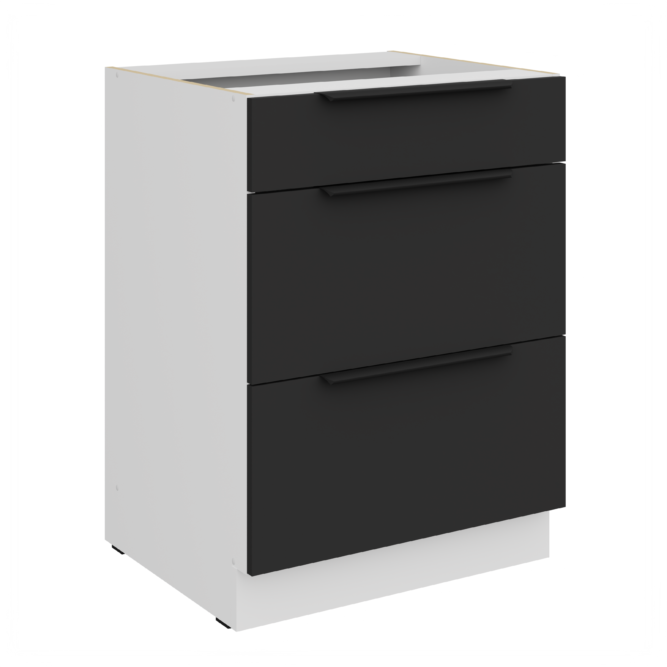 Spodní skříňka Aria 60 D 3S BB - Premium Box Vlastnosti: Materiál Laminovaná dřevotřísková deska o síle 16 mm Zakončené hrany ABS hrana o síle 1 mm Anti Finger Print Jedná se o speciální povrchovou úpravu, kdy na povrchu dvířek / čel zásuvek nezůstávají otisky prstů. Úchyt Matný kovový černý úchyt Sokl Součástí balení Vnitřní barva Vnitřek skříně je bílý Vnitřní uspořádání Tři zásuvky Panty / Pojezdy Pojezdy s tlumeným zavíráním • Barevné kombinace K dispozici je celkem 15 barevný kombinací - 3 barevné varianty korpusu a 5 barevných variant dvířek. Dub artisan korpus Bílá matná korpus Černá matná korpus BL - Black AFM dvířka / čela zásuvek SA - Aquamarine AFM dvířka / čela zásuvek TA - Sandgrau AFM dvířka / čela zásuvek GR - Graphite AFM dvířka / čela zásuvek WH - Crystal white AFM dvířka / čela zásuvek • Rozměry:Šířka:60 cmVýška bez pracovní desky:82 cmHloubka bez pracovní desky:52 cmPočet balení:2 krabice • Odkazy na příslušenství ke kuchyňským linkámKompletní nabídka skříněk ke kuchyňské lince AriaPracovní deskyPříslušenství ke kuchyním •