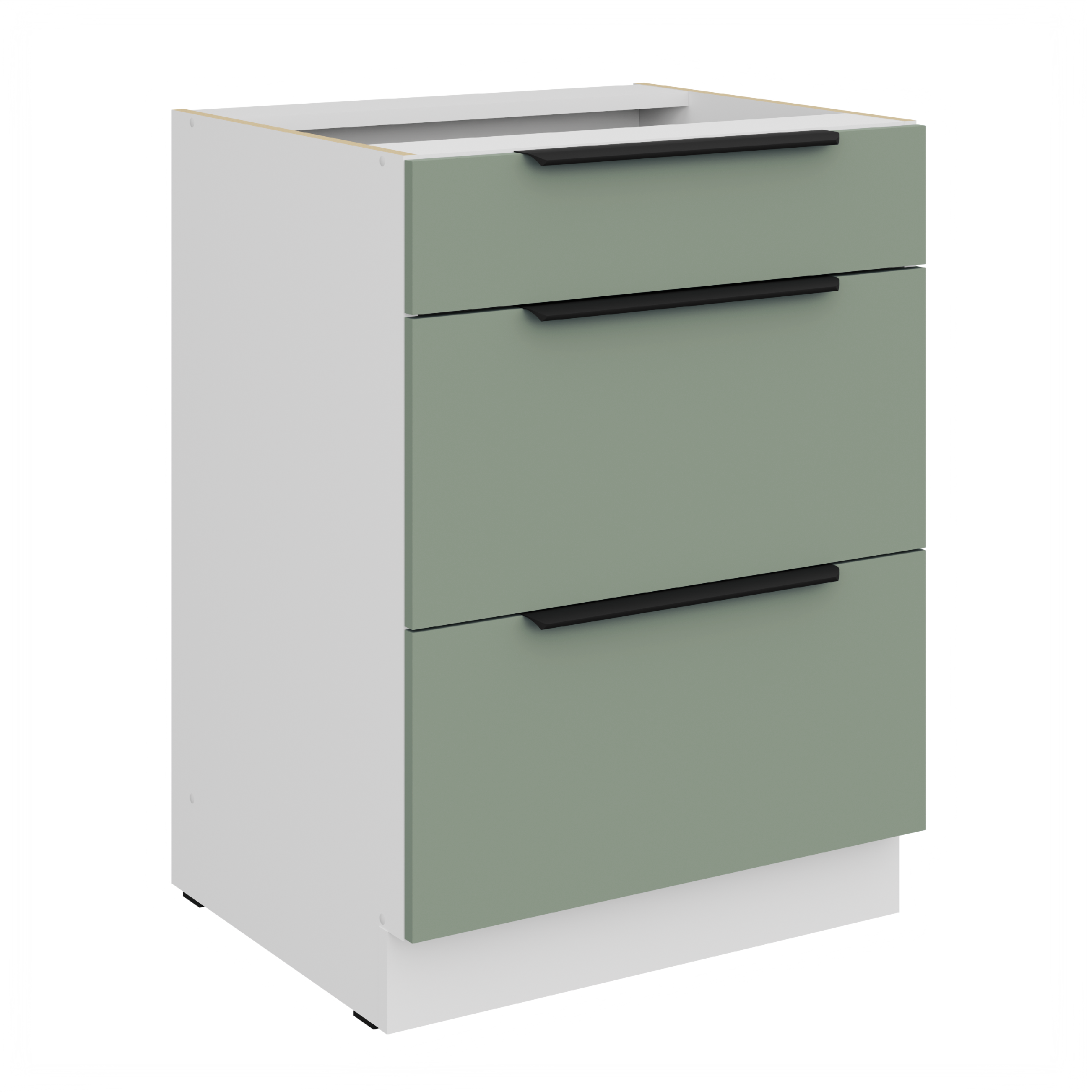 Spodní skříňka Aria 60 D 3S BB - Premium Box Vlastnosti: Materiál Laminovaná dřevotřísková deska o síle 16 mm Zakončené hrany ABS hrana o síle 1 mm Anti Finger Print Jedná se o speciální povrchovou úpravu, kdy na povrchu dvířek / čel zásuvek nezůstávají otisky prstů. Úchyt Matný kovový černý úchyt Sokl Součástí balení Vnitřní barva Vnitřek skříně je bílý Vnitřní uspořádání Tři zásuvky Panty / Pojezdy Pojezdy s tlumeným zavíráním • Barevné kombinace K dispozici je celkem 15 barevný kombinací - 3 barevné varianty korpusu a 5 barevných variant dvířek. Dub artisan korpus Bílá matná korpus Černá matná korpus BL - Black AFM dvířka / čela zásuvek SA - Aquamarine AFM dvířka / čela zásuvek TA - Sandgrau AFM dvířka / čela zásuvek GR - Graphite AFM dvířka / čela zásuvek WH - Crystal white AFM dvířka / čela zásuvek • Rozměry:Šířka:60 cmVýška bez pracovní desky:82 cmHloubka bez pracovní desky:52 cmPočet balení:2 krabice • Odkazy na příslušenství ke kuchyňským linkámKompletní nabídka skříněk ke kuchyňské lince AriaPracovní deskyPříslušenství ke kuchyním •