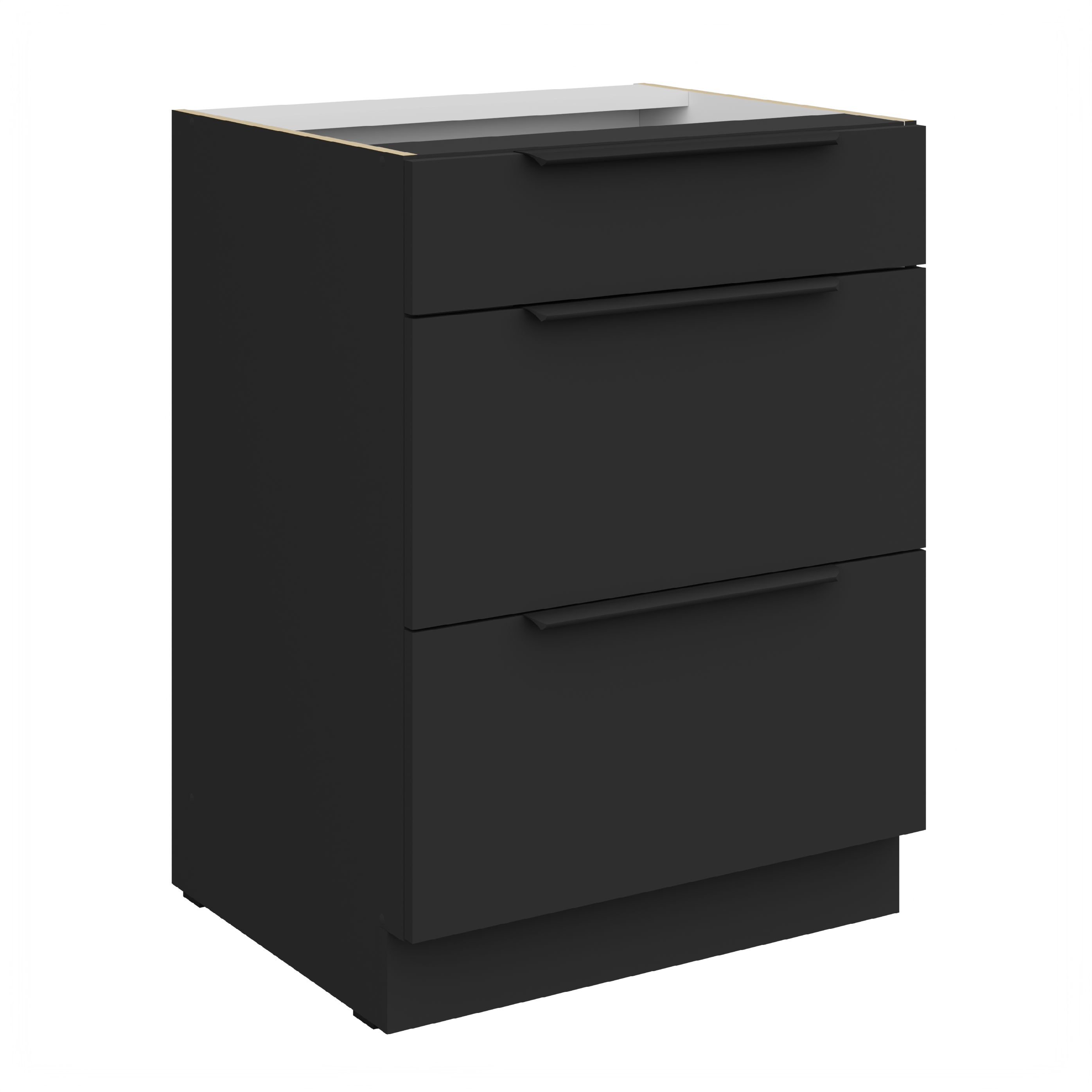 Spodní skříňka Aria 60 D 3S BB - Premium Box Vlastnosti: Materiál Laminovaná dřevotřísková deska o síle 16 mm Zakončené hrany ABS hrana o síle 1 mm Anti Finger Print Jedná se o speciální povrchovou úpravu, kdy na povrchu dvířek / čel zásuvek nezůstávají otisky prstů. Úchyt Matný kovový černý úchyt Sokl Součástí balení Vnitřní barva Vnitřek skříně je bílý Vnitřní uspořádání Tři zásuvky Panty / Pojezdy Pojezdy s tlumeným zavíráním • Barevné kombinace K dispozici je celkem 15 barevný kombinací - 3 barevné varianty korpusu a 5 barevných variant dvířek. Dub artisan korpus Bílá matná korpus Černá matná korpus BL - Black AFM dvířka / čela zásuvek SA - Aquamarine AFM dvířka / čela zásuvek TA - Sandgrau AFM dvířka / čela zásuvek GR - Graphite AFM dvířka / čela zásuvek WH - Crystal white AFM dvířka / čela zásuvek • Rozměry:Šířka:60 cmVýška bez pracovní desky:82 cmHloubka bez pracovní desky:52 cmPočet balení:2 krabice • Odkazy na příslušenství ke kuchyňským linkámKompletní nabídka skříněk ke kuchyňské lince AriaPracovní deskyPříslušenství ke kuchyním •