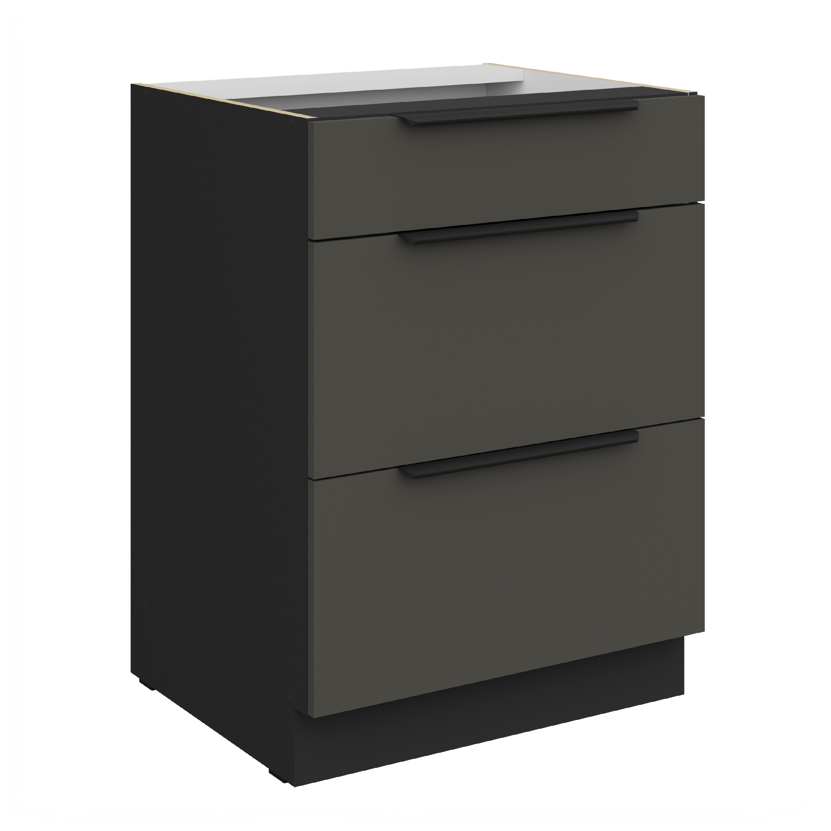 Spodní skříňka Aria 60 D 3S BB - Premium Box Vlastnosti: Materiál Laminovaná dřevotřísková deska o síle 16 mm Zakončené hrany ABS hrana o síle 1 mm Anti Finger Print Jedná se o speciální povrchovou úpravu, kdy na povrchu dvířek / čel zásuvek nezůstávají otisky prstů. Úchyt Matný kovový černý úchyt Sokl Součástí balení Vnitřní barva Vnitřek skříně je bílý Vnitřní uspořádání Tři zásuvky Panty / Pojezdy Pojezdy s tlumeným zavíráním • Barevné kombinace K dispozici je celkem 15 barevný kombinací - 3 barevné varianty korpusu a 5 barevných variant dvířek. Dub artisan korpus Bílá matná korpus Černá matná korpus BL - Black AFM dvířka / čela zásuvek SA - Aquamarine AFM dvířka / čela zásuvek TA - Sandgrau AFM dvířka / čela zásuvek GR - Graphite AFM dvířka / čela zásuvek WH - Crystal white AFM dvířka / čela zásuvek • Rozměry:Šířka:60 cmVýška bez pracovní desky:82 cmHloubka bez pracovní desky:52 cmPočet balení:2 krabice • Odkazy na příslušenství ke kuchyňským linkámKompletní nabídka skříněk ke kuchyňské lince AriaPracovní deskyPříslušenství ke kuchyním •