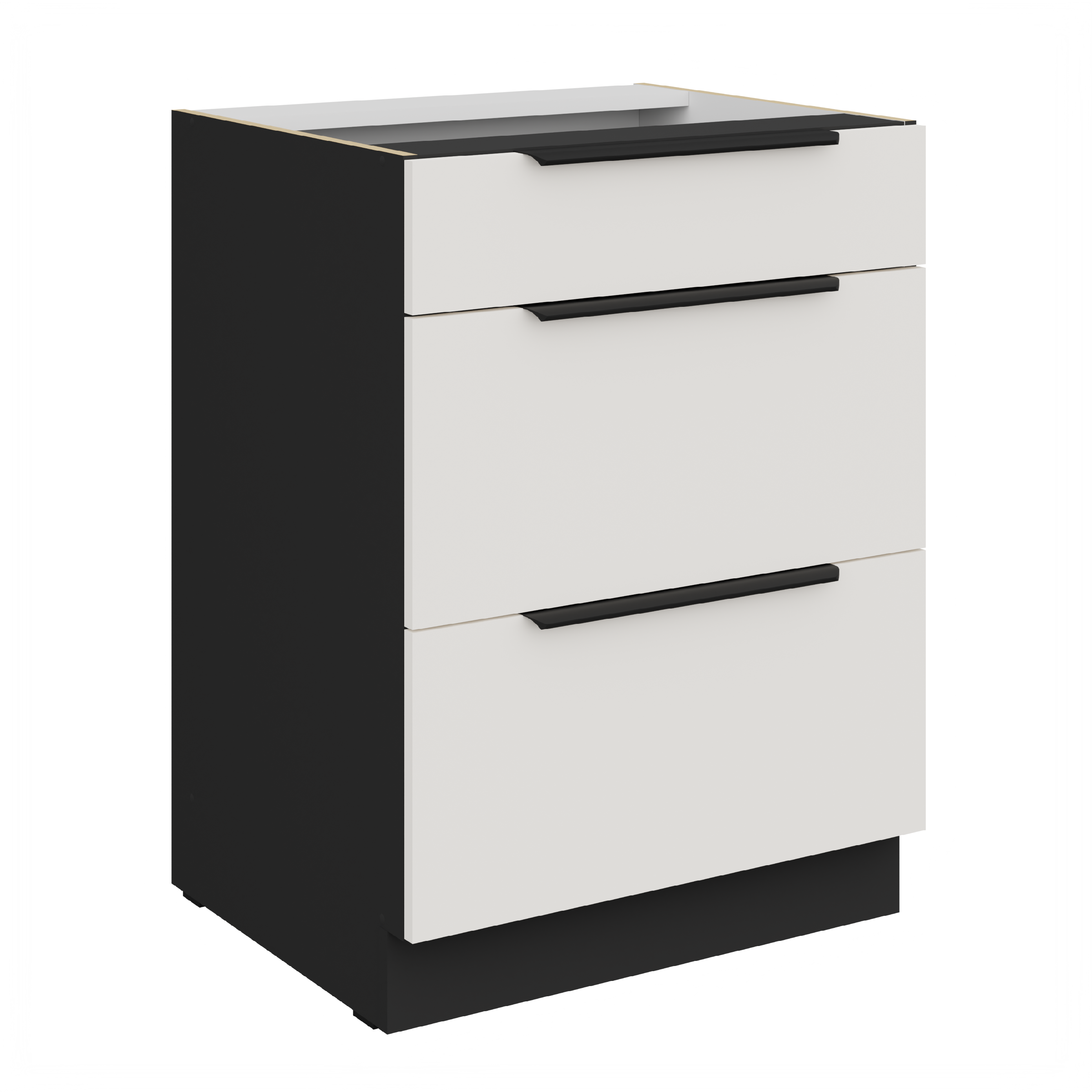 Spodní skříňka Aria 60 D 3S BB - Premium Box Vlastnosti: Materiál Laminovaná dřevotřísková deska o síle 16 mm Zakončené hrany ABS hrana o síle 1 mm Anti Finger Print Jedná se o speciální povrchovou úpravu, kdy na povrchu dvířek / čel zásuvek nezůstávají otisky prstů. Úchyt Matný kovový černý úchyt Sokl Součástí balení Vnitřní barva Vnitřek skříně je bílý Vnitřní uspořádání Tři zásuvky Panty / Pojezdy Pojezdy s tlumeným zavíráním • Barevné kombinace K dispozici je celkem 15 barevný kombinací - 3 barevné varianty korpusu a 5 barevných variant dvířek. Dub artisan korpus Bílá matná korpus Černá matná korpus BL - Black AFM dvířka / čela zásuvek SA - Aquamarine AFM dvířka / čela zásuvek TA - Sandgrau AFM dvířka / čela zásuvek GR - Graphite AFM dvířka / čela zásuvek WH - Crystal white AFM dvířka / čela zásuvek • Rozměry:Šířka:60 cmVýška bez pracovní desky:82 cmHloubka bez pracovní desky:52 cmPočet balení:2 krabice • Odkazy na příslušenství ke kuchyňským linkámKompletní nabídka skříněk ke kuchyňské lince AriaPracovní deskyPříslušenství ke kuchyním •