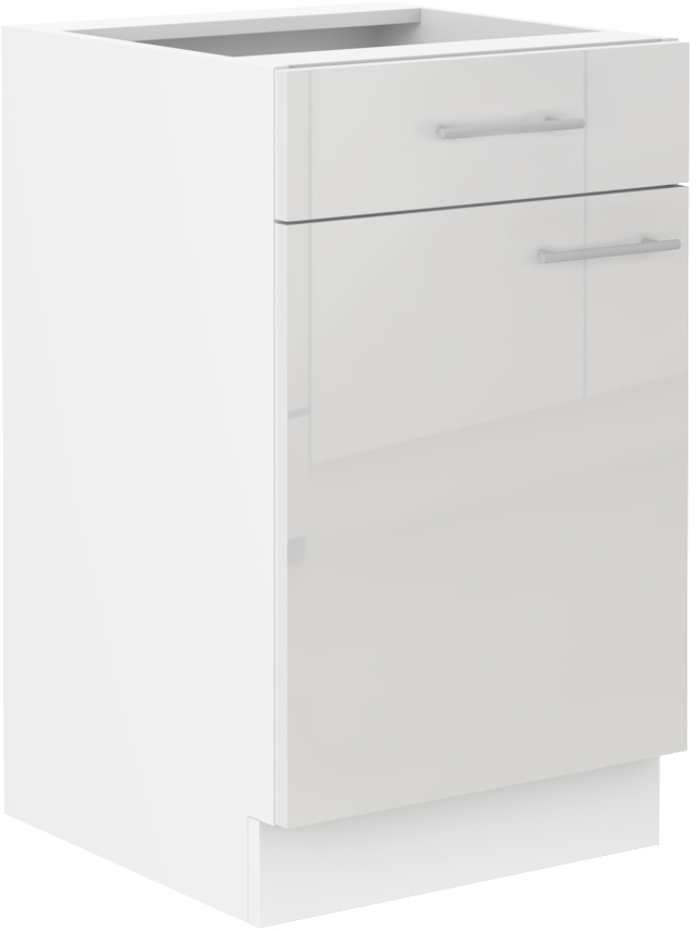 Spodní skříňka Lara 50 D 1F 1S BB Vlastnosti: Materiál Laminovaná dřevotřísková deska o síle 16 mm Zakončené hrany ABS hrana o síle 1 mm Úchyt Lesklý kovový stříbrný úchyt Sokl Součástí balení Vnitřní barva Vnitřek skříně je bílý Vnitřní uspořádání Jedna police Panty / Pojezdy Panty a pojezdy s tlumeným zavíráním • Barevná kombinace Bílá matná Korpus Cappucino lesk Dvířka Šedý lesk Dvířka Bílá lesklá Dvířka • Rozměry:Šířka:50 cmVýška bez pracovní desky:82 cmHloubka bez pracovní desky:52 cmPočet balení:2 krabice • Odkazy na příslušenství ke kuchyňským linkámKompletní nabídka skříněk ke kuchyňské lince LaraPracovní deskyPříslušenství ke kuchyním •