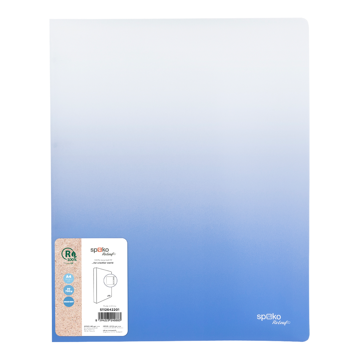 Pevné desky s kroužkovou mechanikou hodné pro rychlou archivaci doma nebo v kanceláři. Šíře desek umožňuje vkládat i obaly s děrováním, aniž by přesahovaly ven. Kvalitní a odolné zpracování chrání obsah uvnitř před nečistotami nebo poškozením.formát: A4materiál: 100 % recyklovaný PP, 700 µmrozměry: 260 × 315 mm, šíře hřbetu: 20 mmkroužková mechanika, „O“ 4 × Ø 16 mmbarva: modráúprava gradientobsah balení: 1 ks