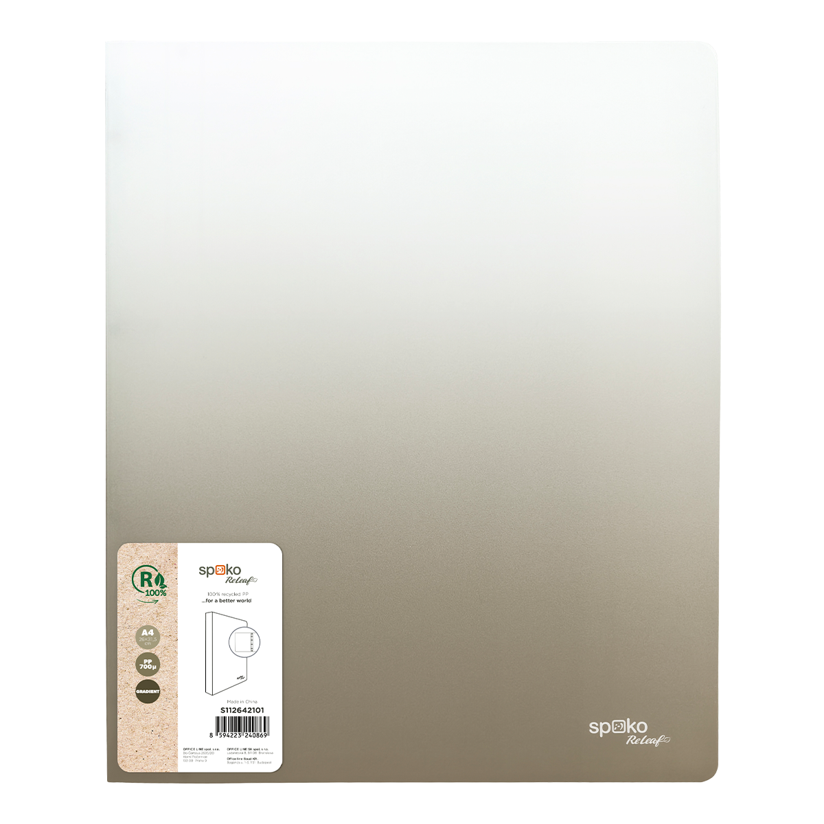 Pevné desky s kroužkovou mechanikou hodné pro rychlou archivaci doma nebo v kanceláři. Šíře desek umožňuje vkládat i obaly s děrováním, aniž by přesahovaly ven. Kvalitní a odolné zpracování chrání obsah uvnitř před nečistotami nebo poškozením.formát: A4materiál: 100 % recyklovaný PP, 700 µmrozměry: 260 × 315 mm, šíře hřbetu: 20 mmkroužková mechanika, „O“ 4 × Ø 16 mmbarva: šedáúprava gradientobsah balení: 1 ks