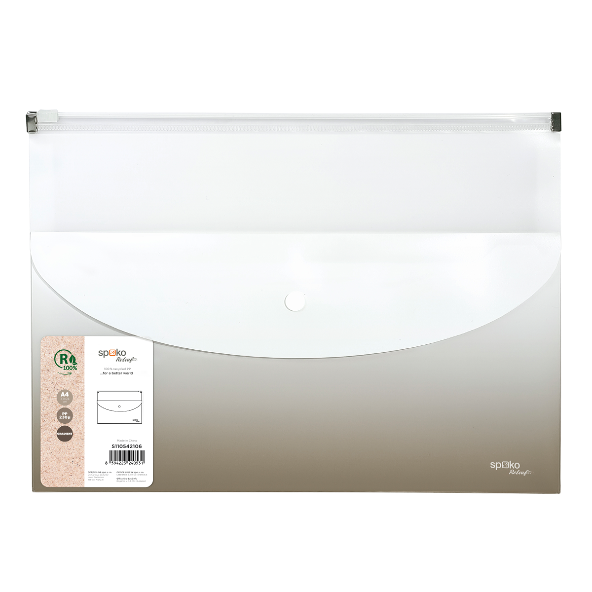 Kombinovaná obálka s úložnou kapsou vhodná pro přenášení dokumentů a menších drobností. Hlavní kapsa se uzavírá pomocí zipu, který brání poškození dokumentů uvnitř. Menší přední kapsa je opatřena drukem pro snadnou manipulaci.formát: A4materiál: 100 % recyklovaný PP, 230 µmrozměry: 330 × 240 mmrozšířitelná na 3 cmbarva: šedáúprava gradientbalení: 6 ks